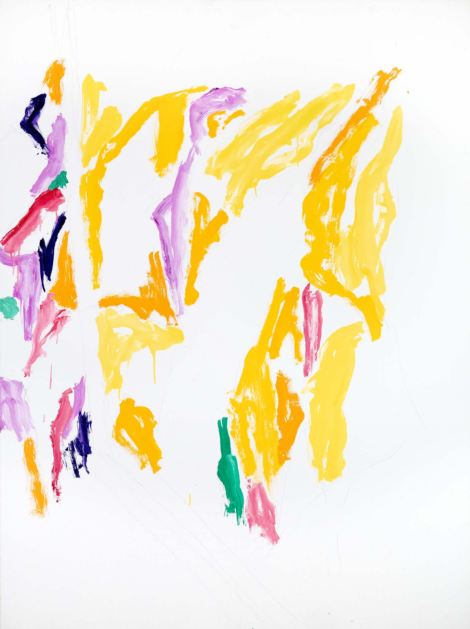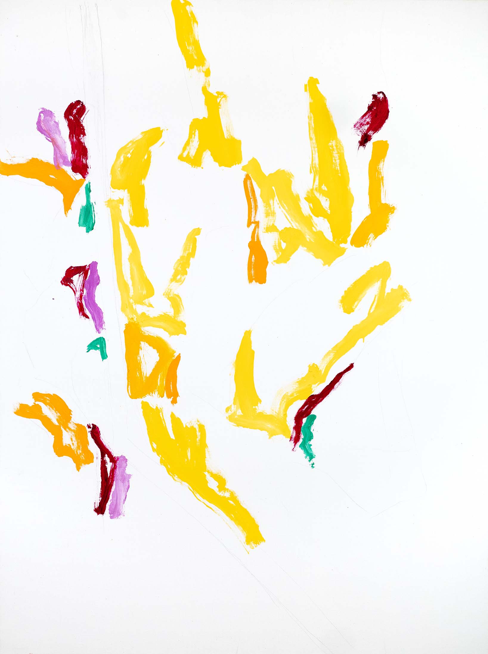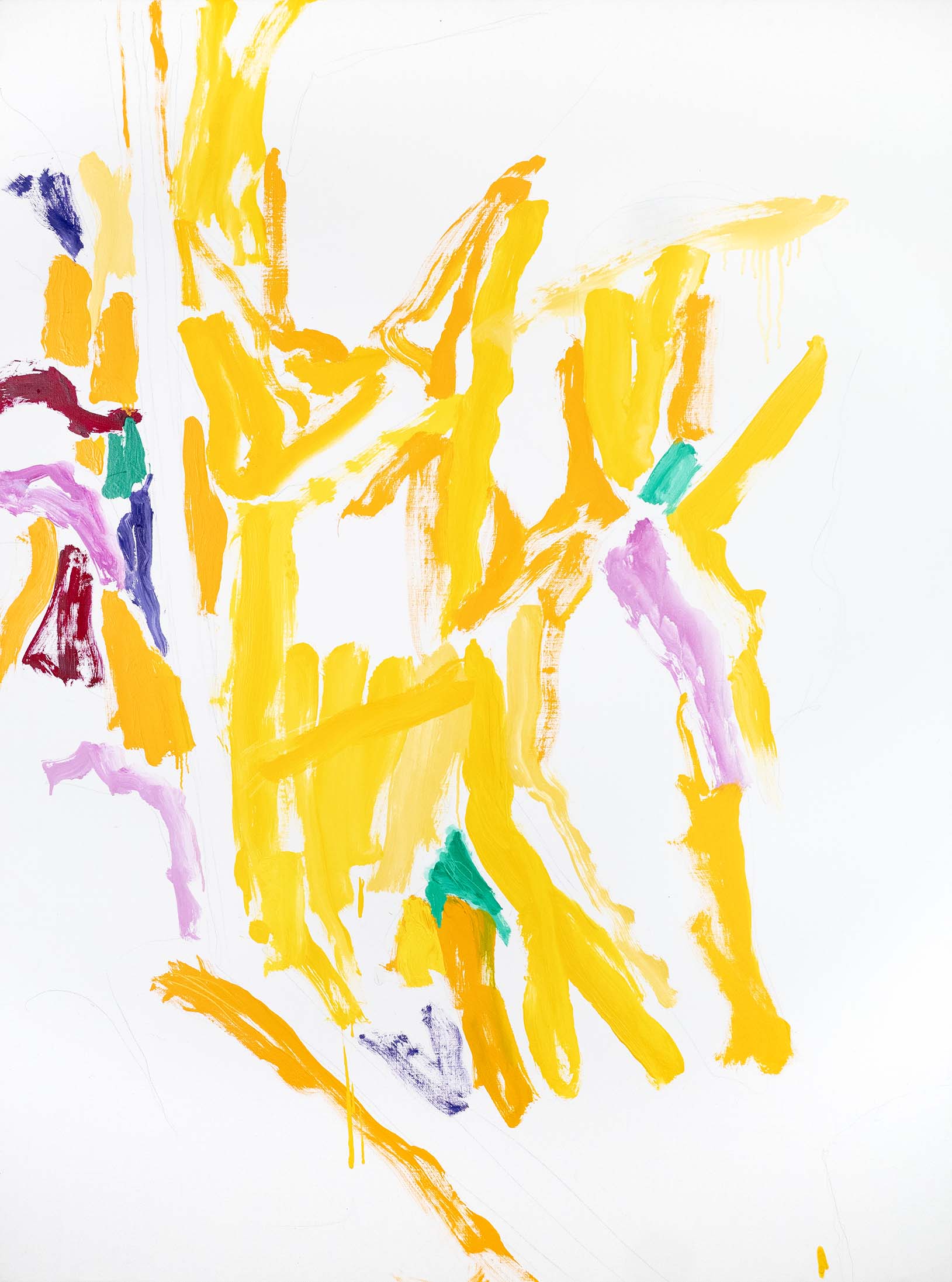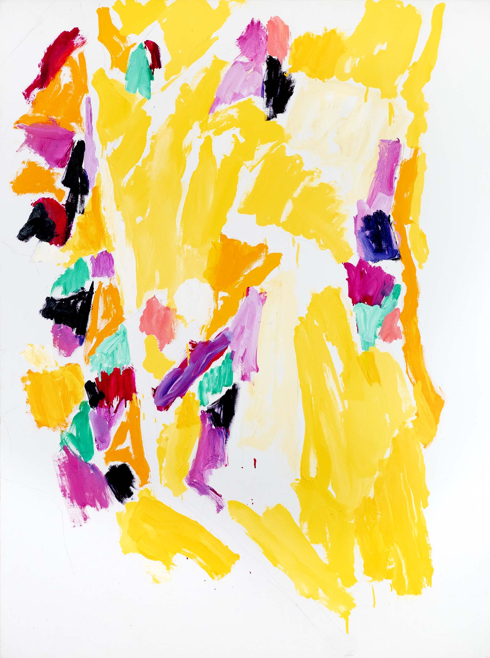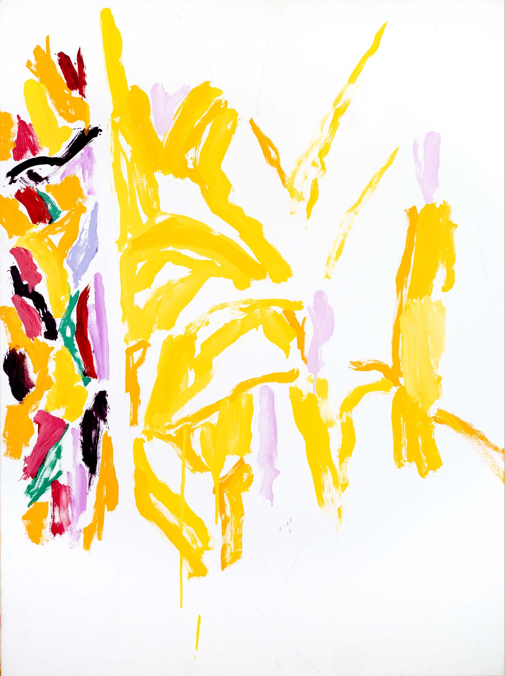 Au tournant des années 2000, l’abstraction s’accentue. Il n’y a pratiquement plus de sujet reconnaissable ; l’ensemble est fait de taches, de jets, de masses et d’oppositions, d’équilibres et de déséquilibres. Une nouveauté stylistique notable est l’importance que vient prendre la toile blanche, encadrée et guidée, magnifiée même, par le jeu de couleurs environnant.