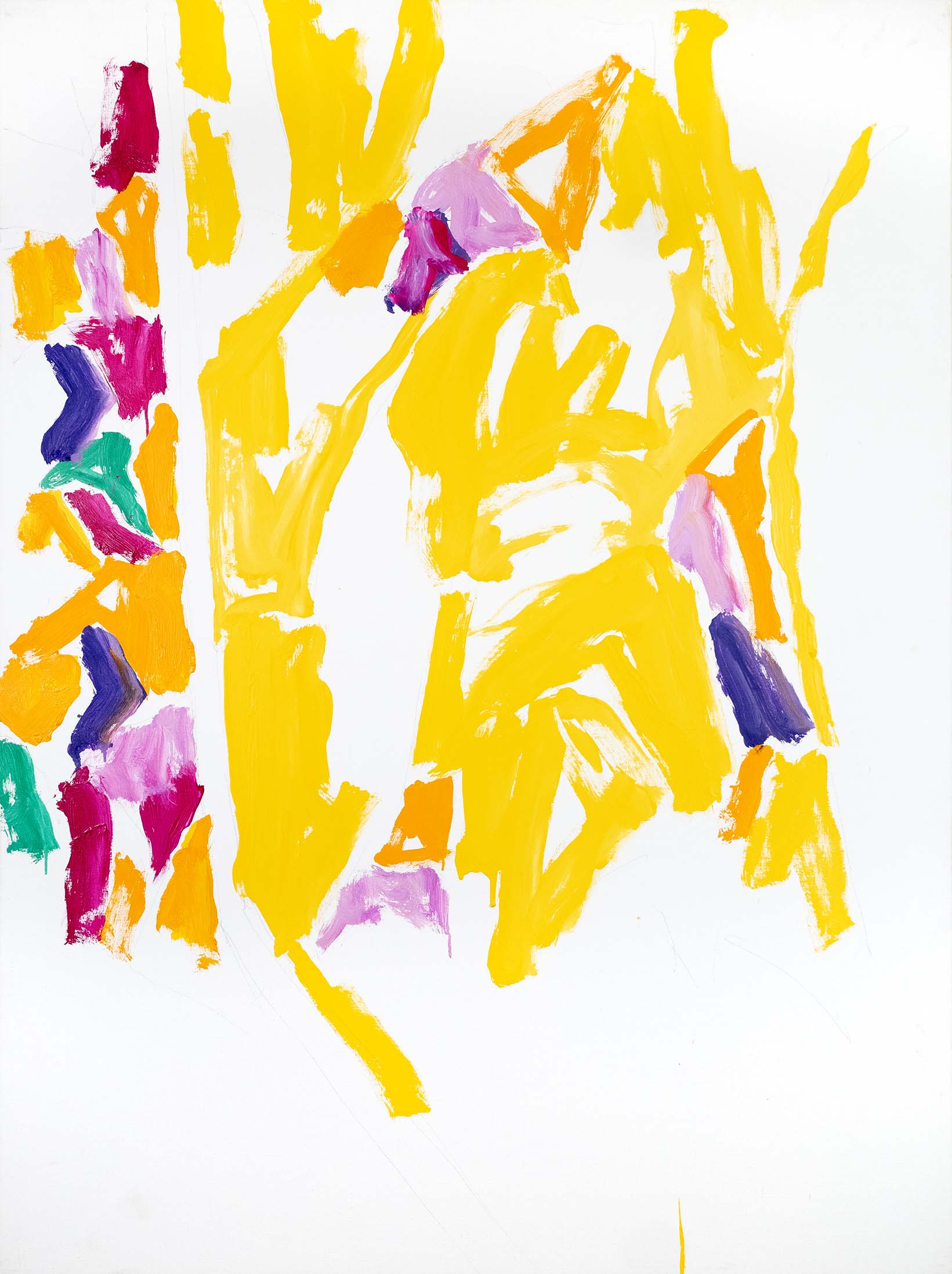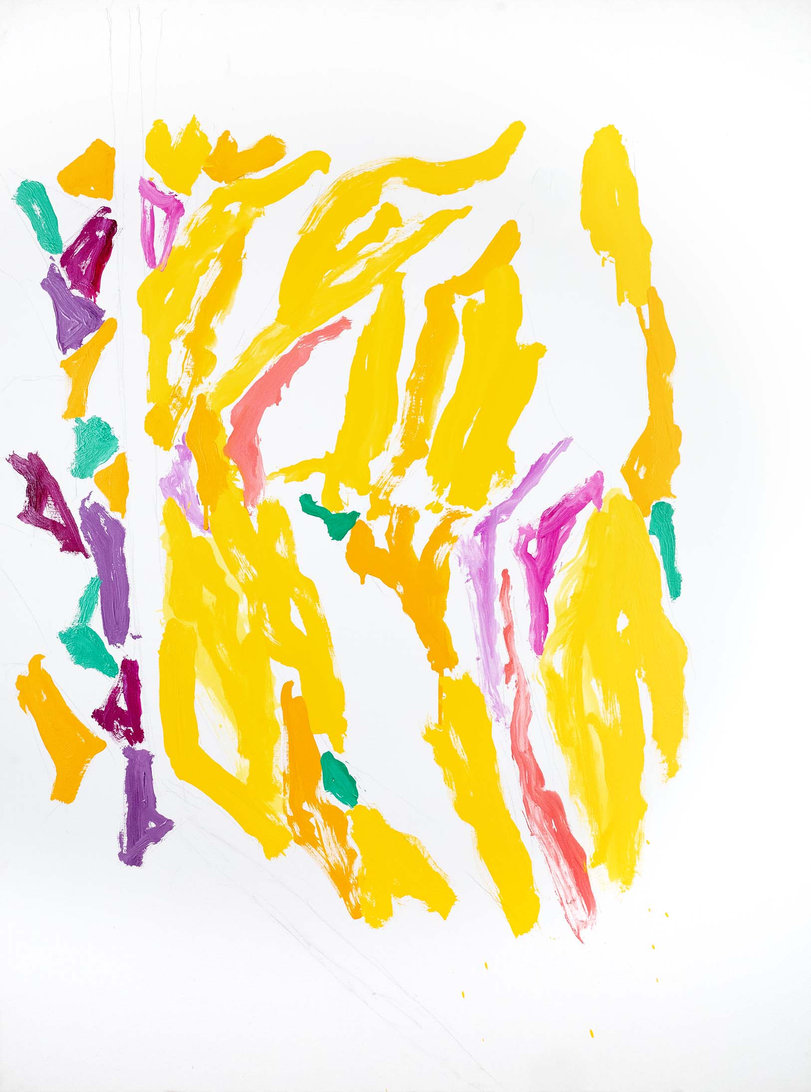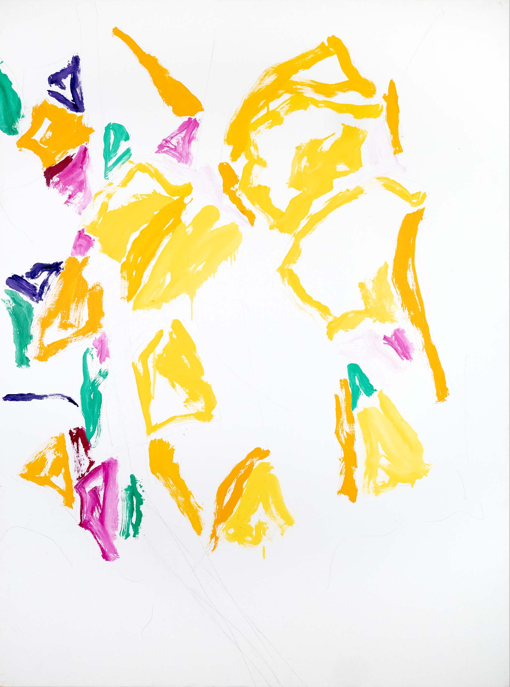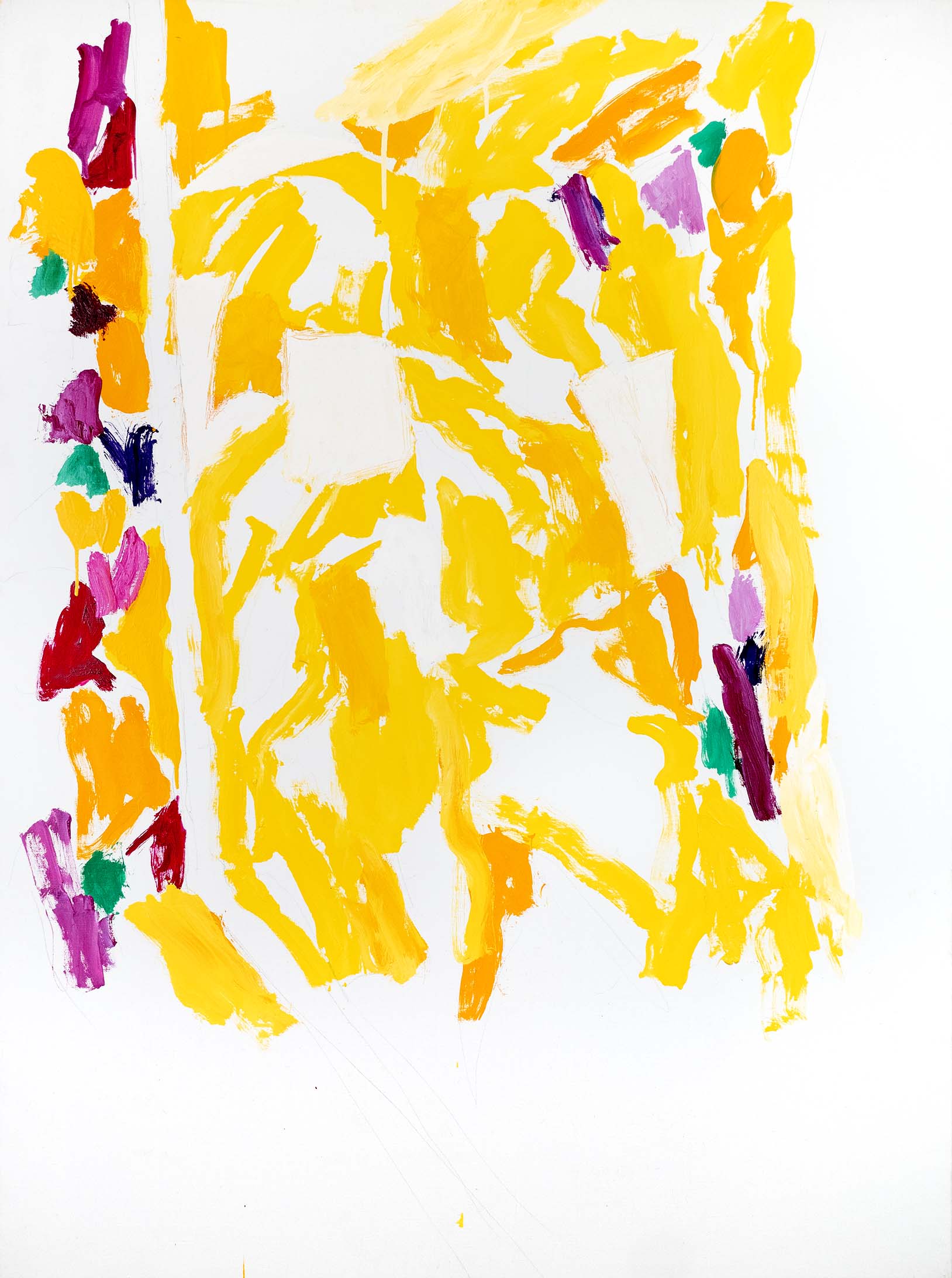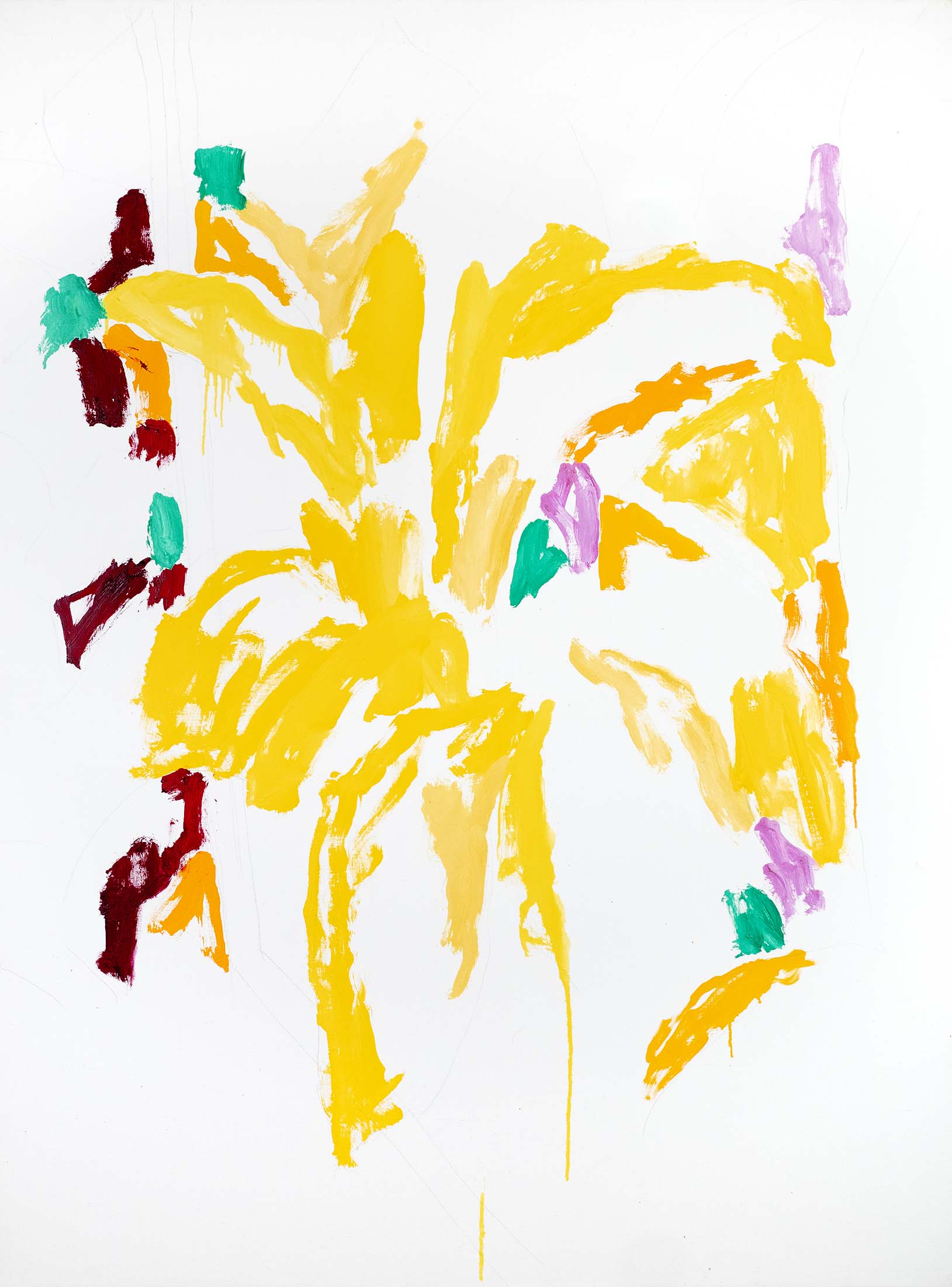 Au tournant des années 2000, l’abstraction s’accentue. Il n’y a pratiquement plus de sujet reconnaissable ; l’ensemble est fait de taches, de jets, de masses et d’oppositions, d’équilibres et de déséquilibres. Une nouveauté stylistique notable est l’importance que vient prendre la toile blanche, encadrée et guidée, magnifiée même, par le jeu de couleurs environnant.
