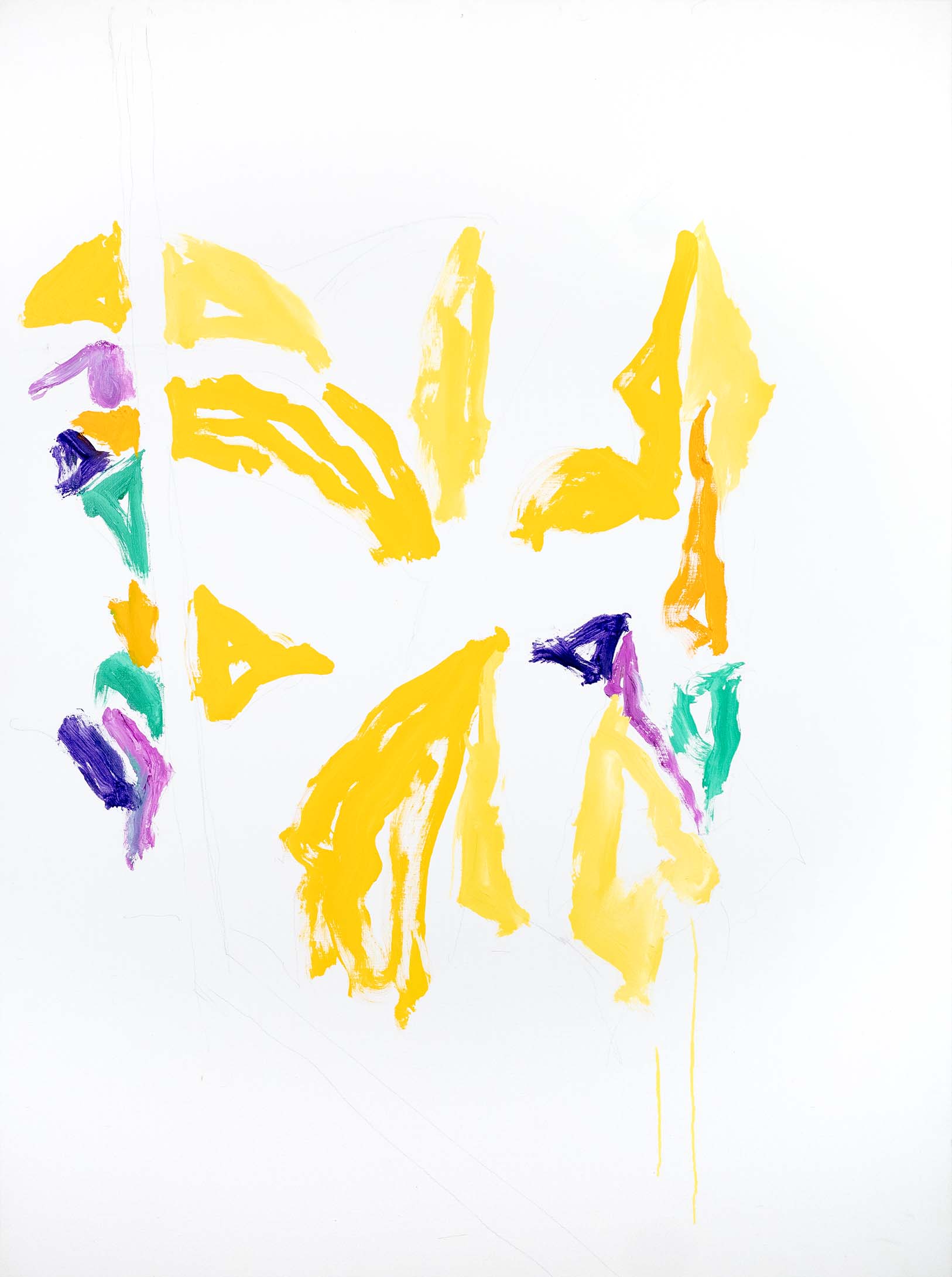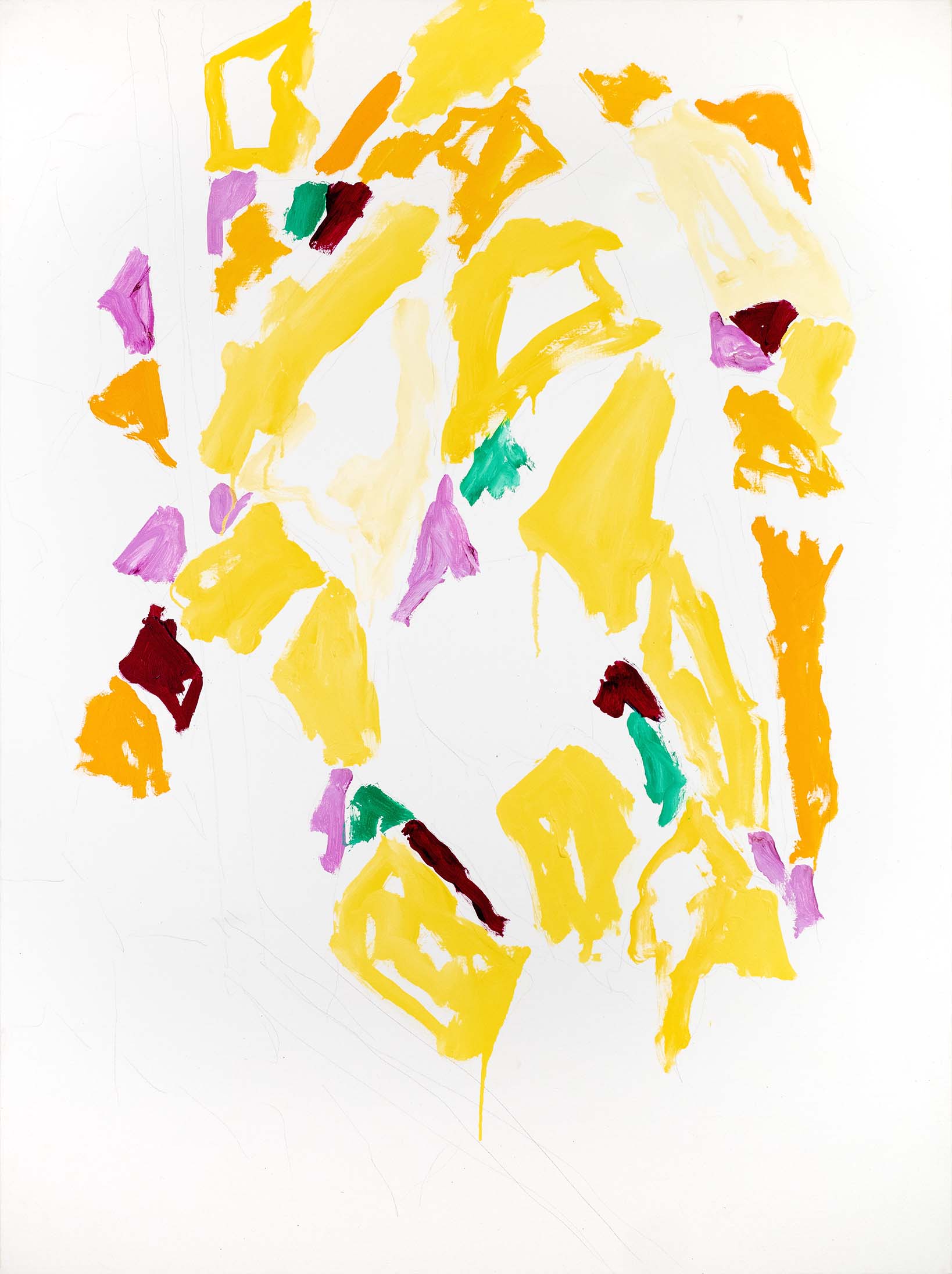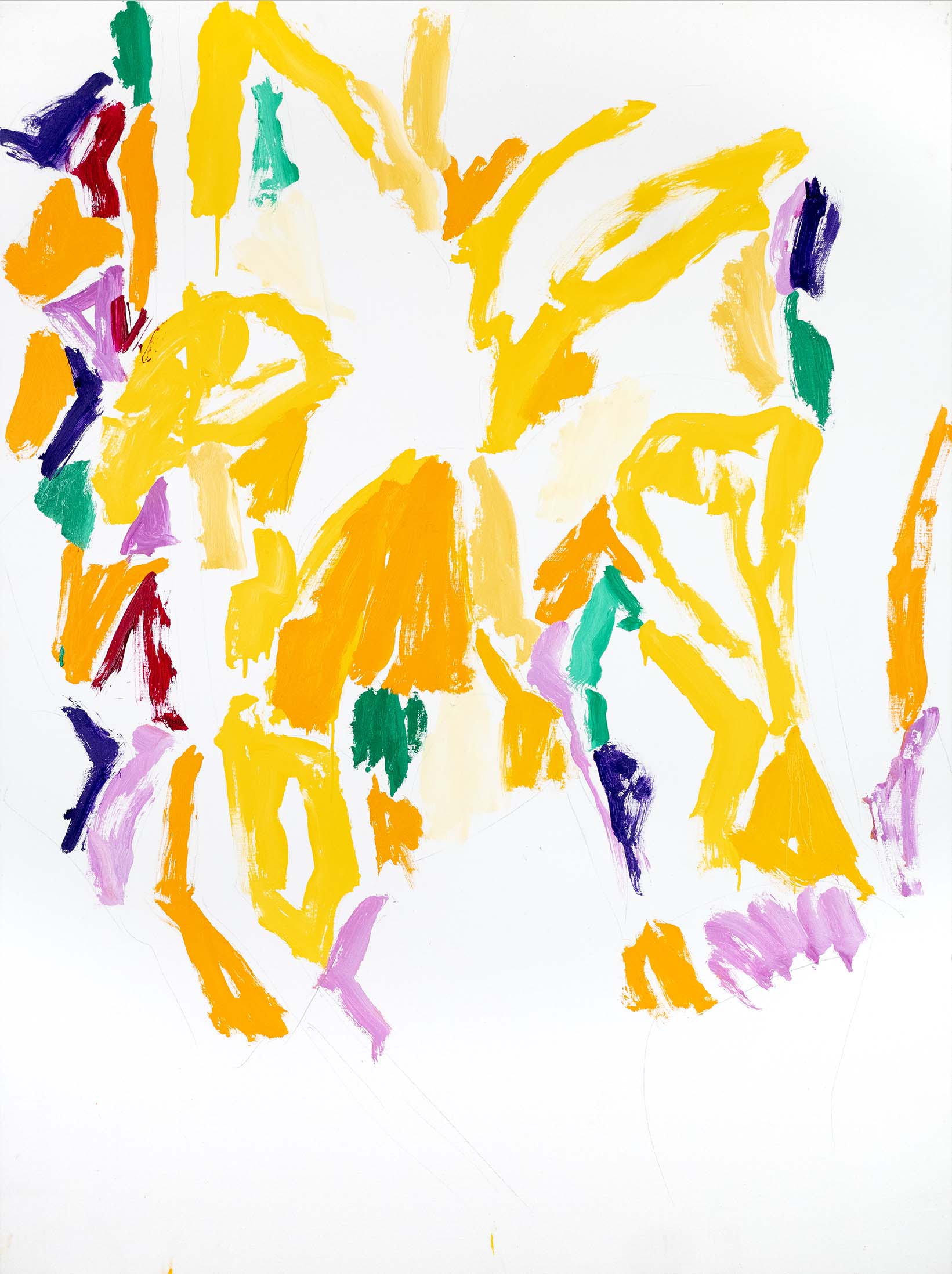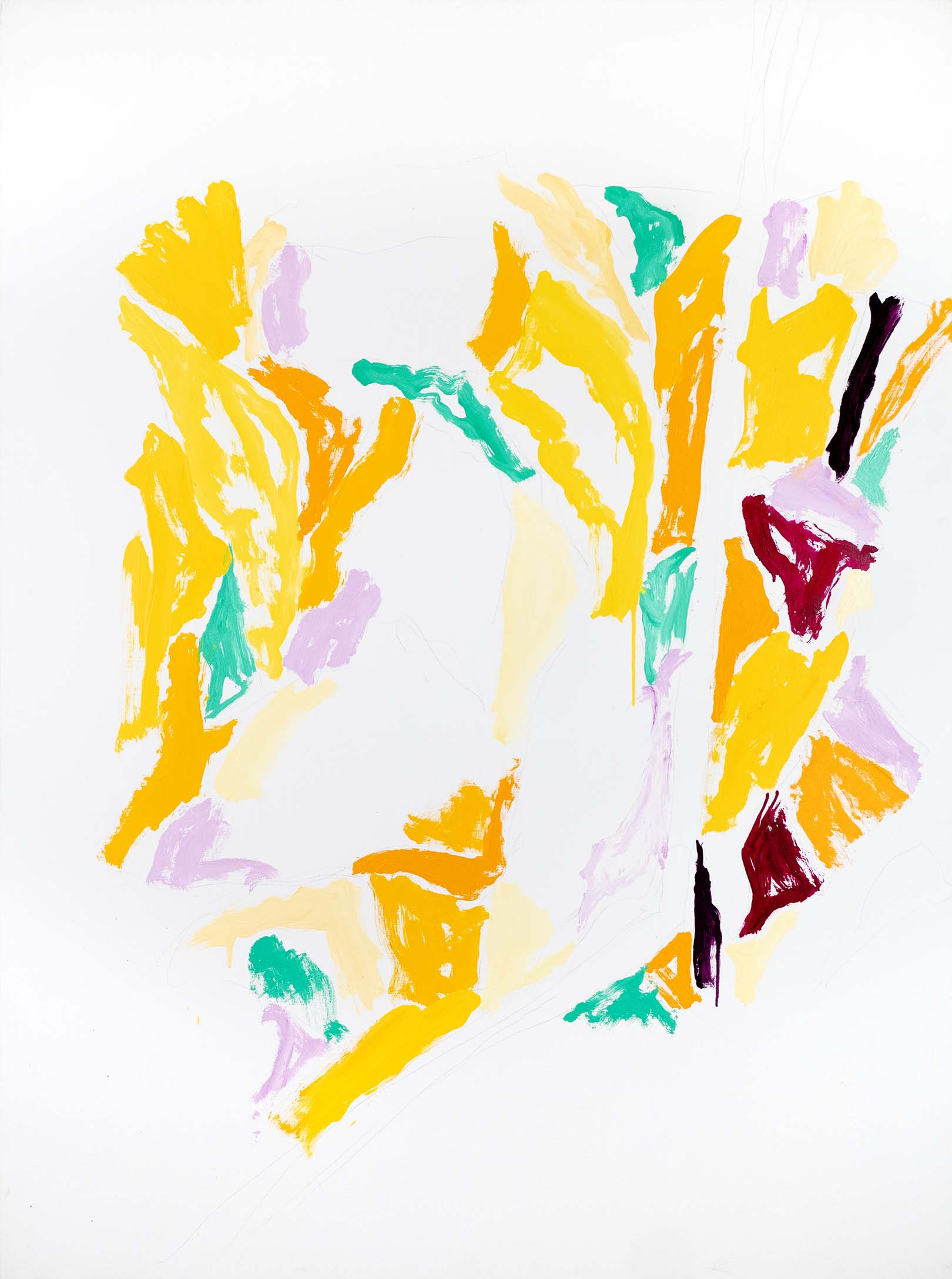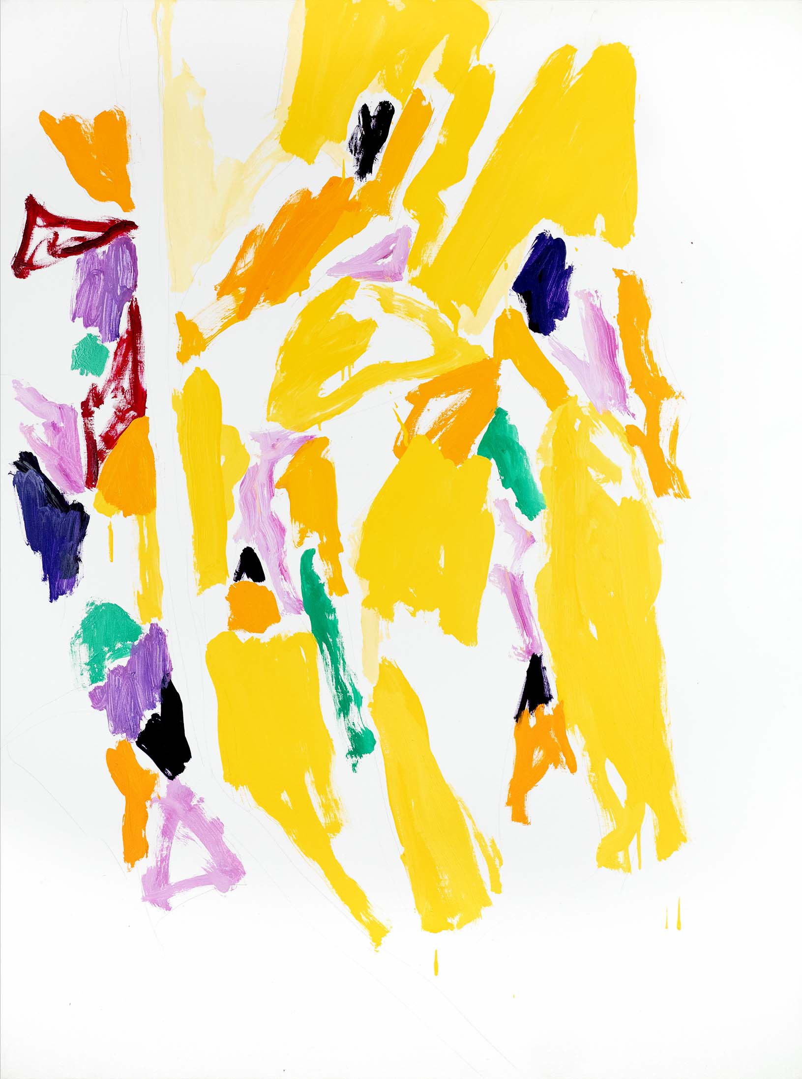 Au tournant des années 2000, l’abstraction s’accentue. Il n’y a pratiquement plus de sujet reconnaissable ; l’ensemble est fait de taches, de jets, de masses et d’oppositions, d’équilibres et de déséquilibres. Une nouveauté stylistique notable est l’importance que vient prendre la toile blanche, encadrée et guidée, magnifiée même, par le jeu de couleurs environnant.