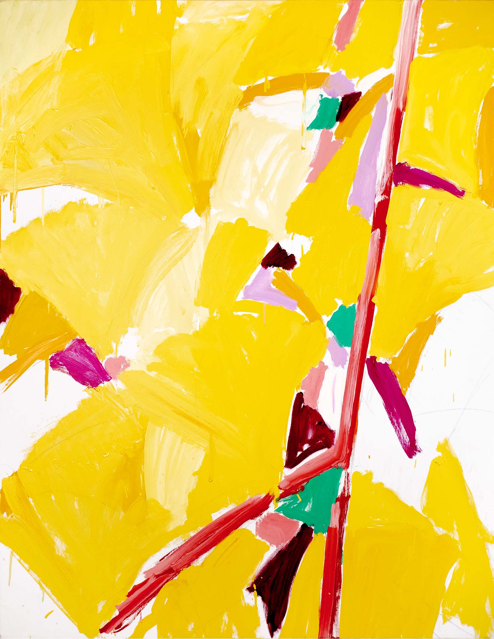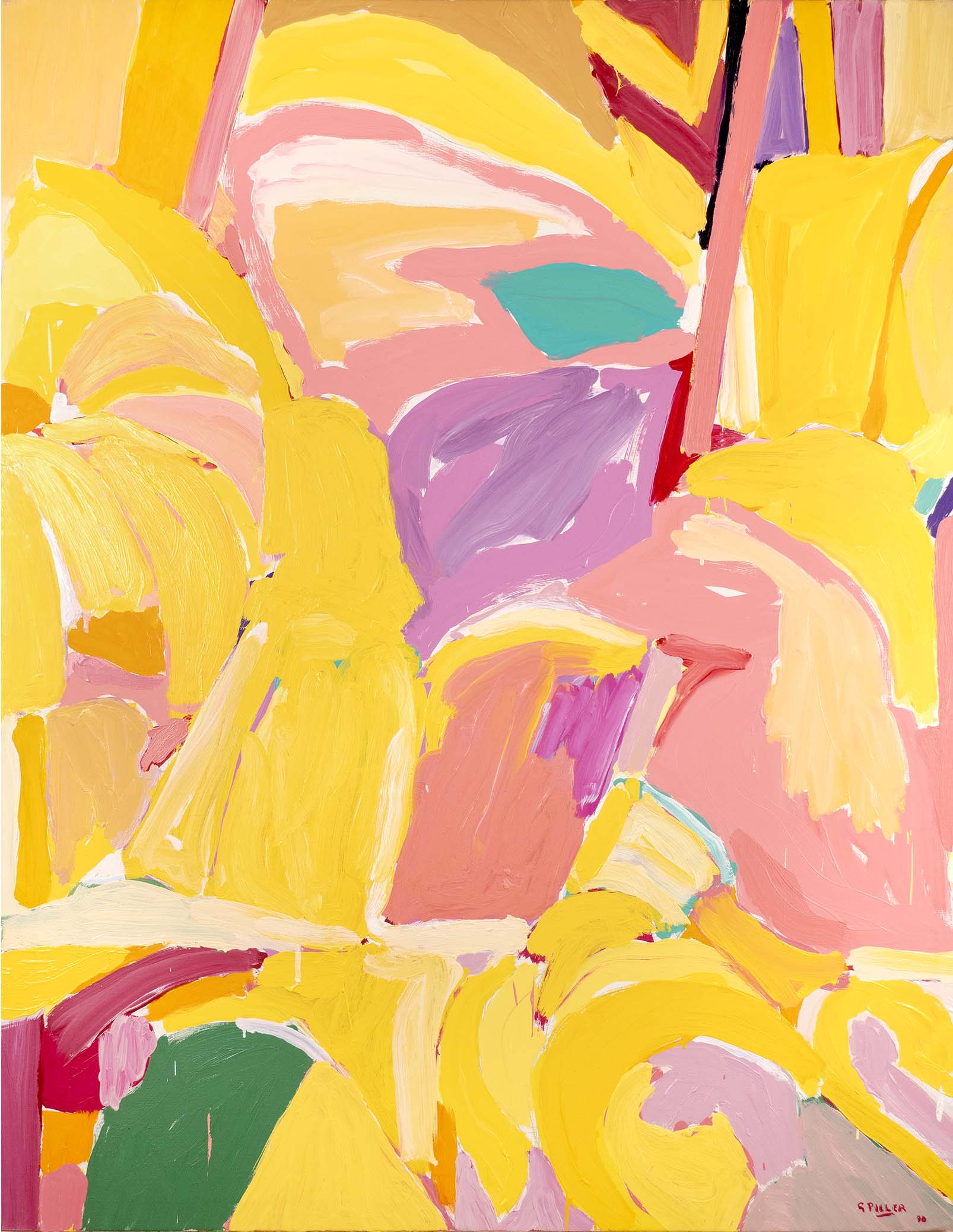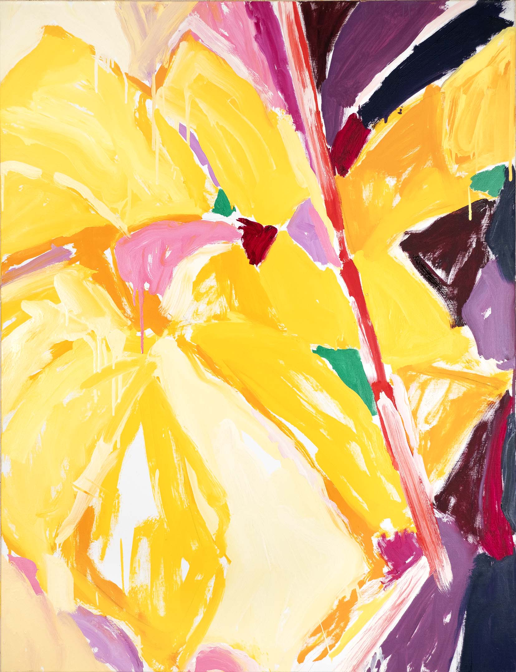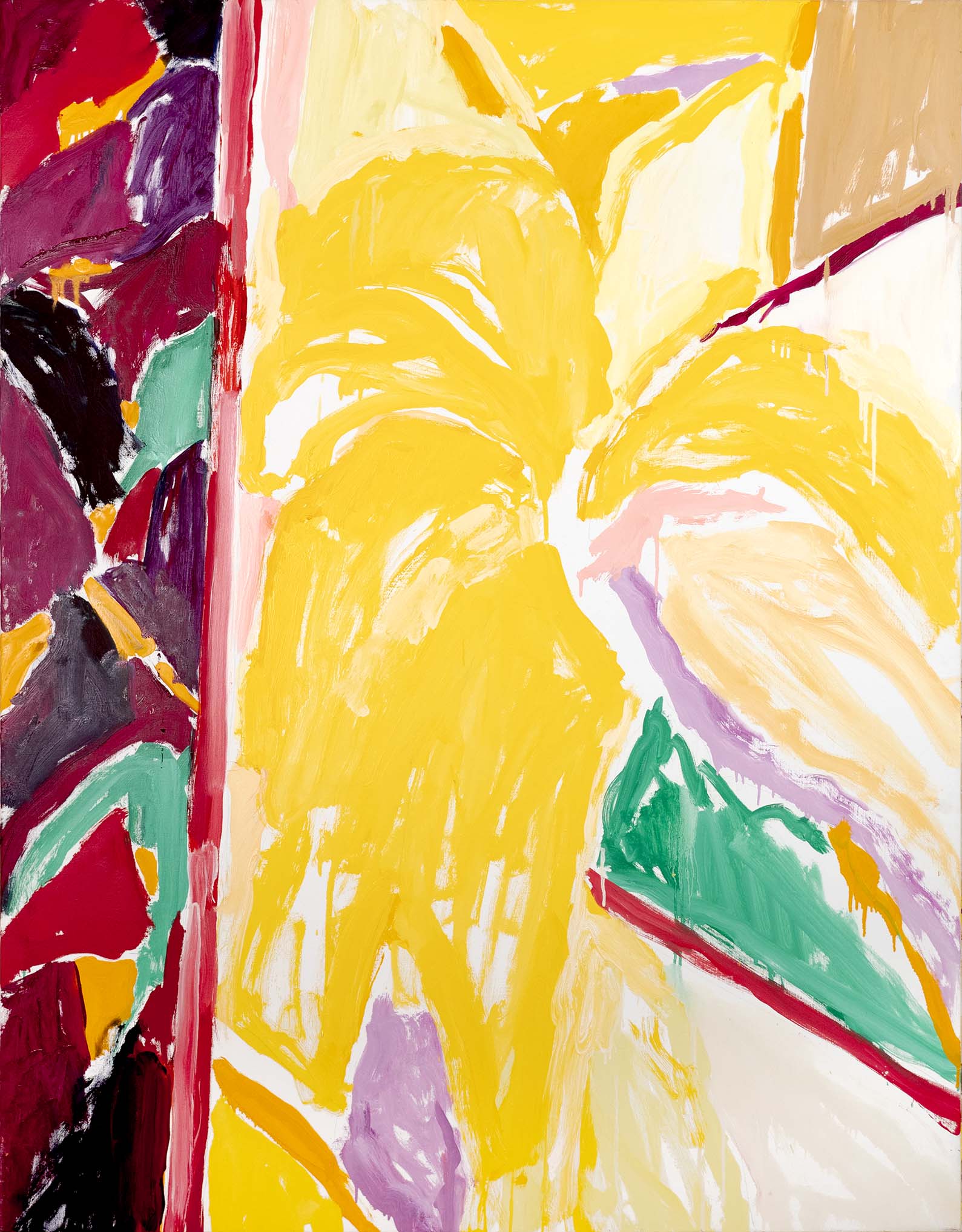 La recherche d’oppositions vives entre vides et pleins, clairs et obscurs, a atteint une sorte de maturité dès la seconde moitié des années 1980. La décennie suivante voit se prolonger cet acquis, tandis que l’inspiration végétale, bien que toujours sous-jacente, se fait de moins en moins explicite. Peu à peu, un nouvel élément visuel fait son apparition : une barre, le plus souvent verticale, vient séparer la toile en deux parties, l’une sombre, l’autre claire, comme pour rappeler les intérieurs des premières huiles, avec leur fenêtre donnant au dehors ou inversement.