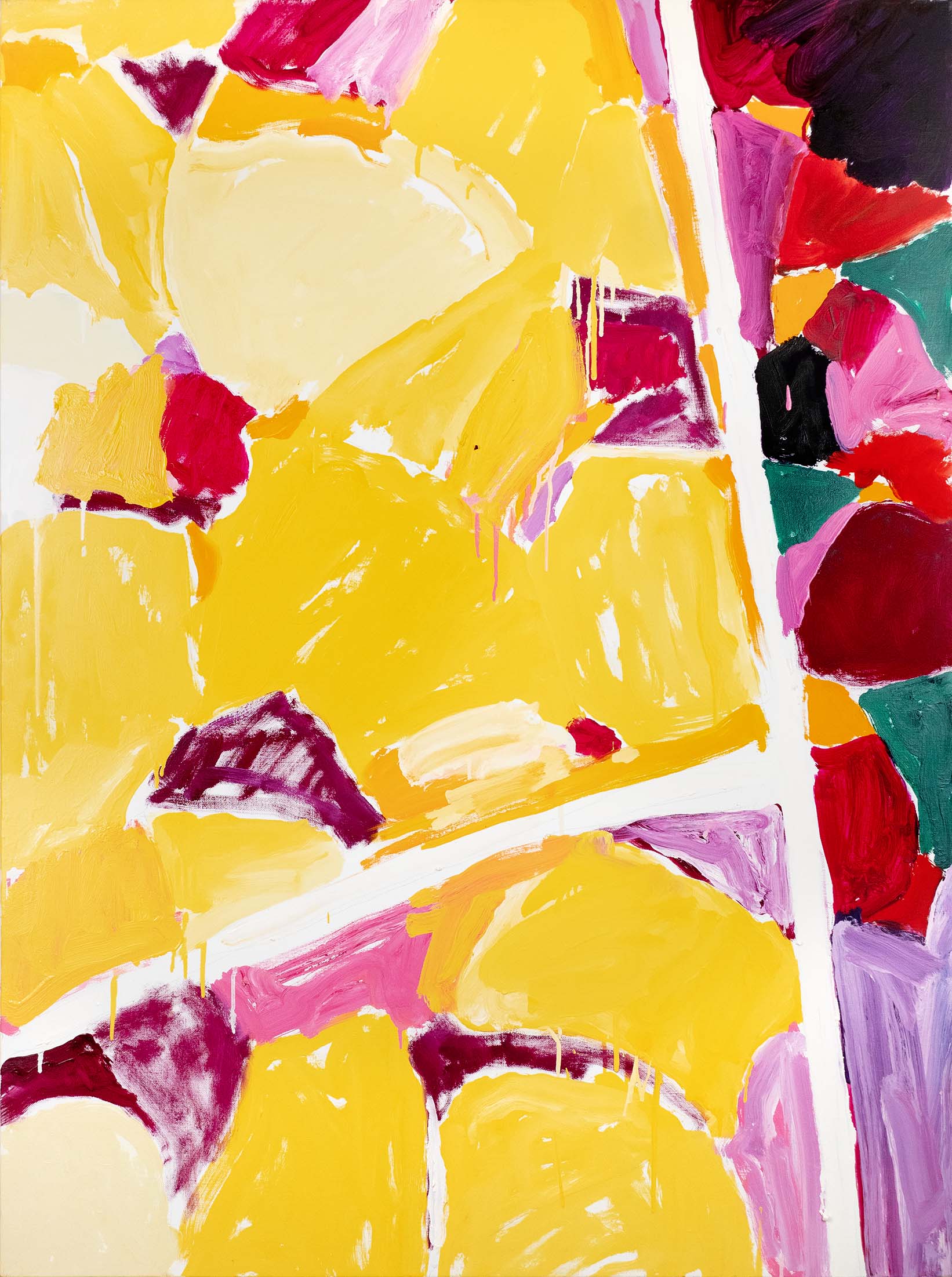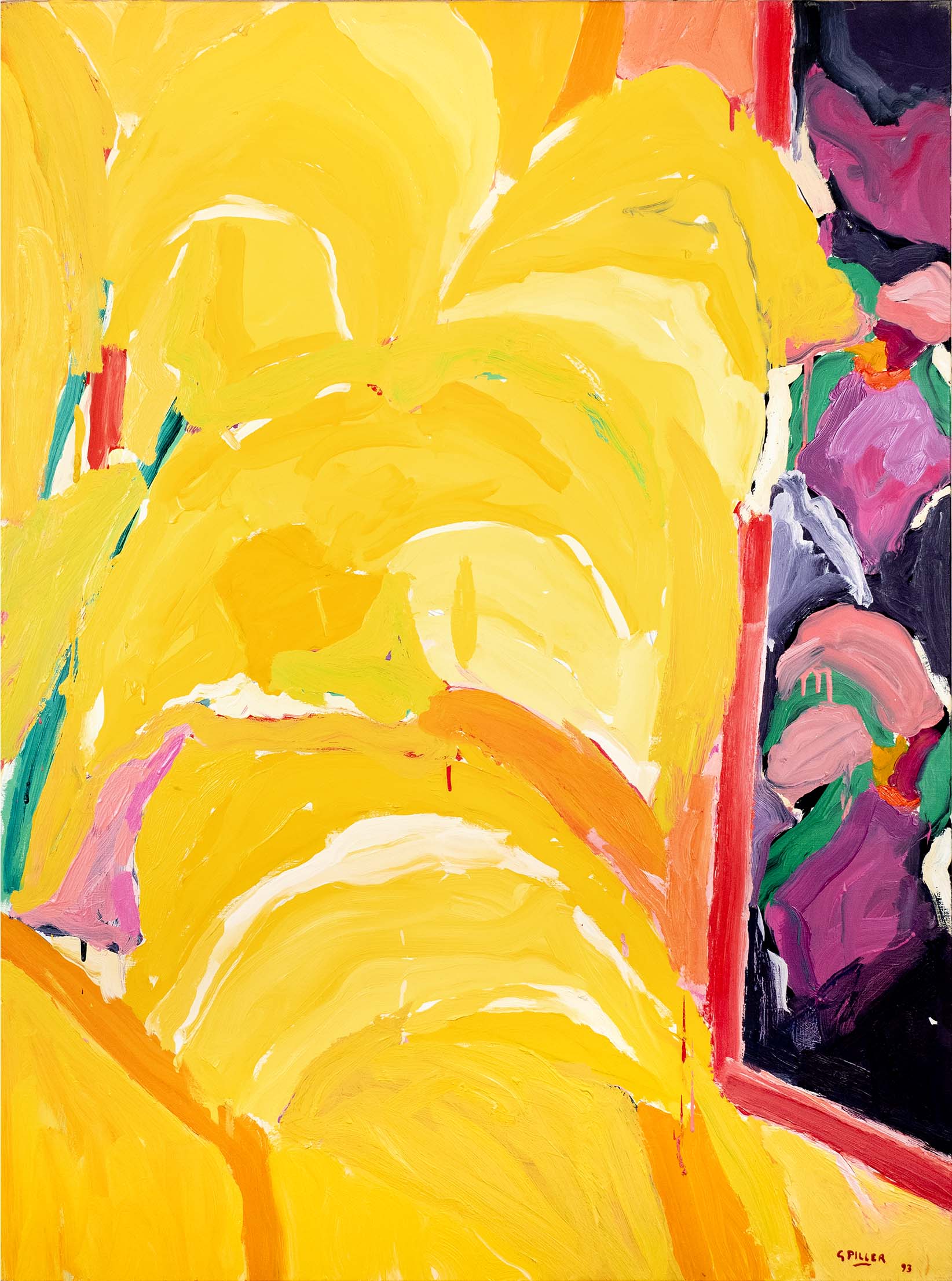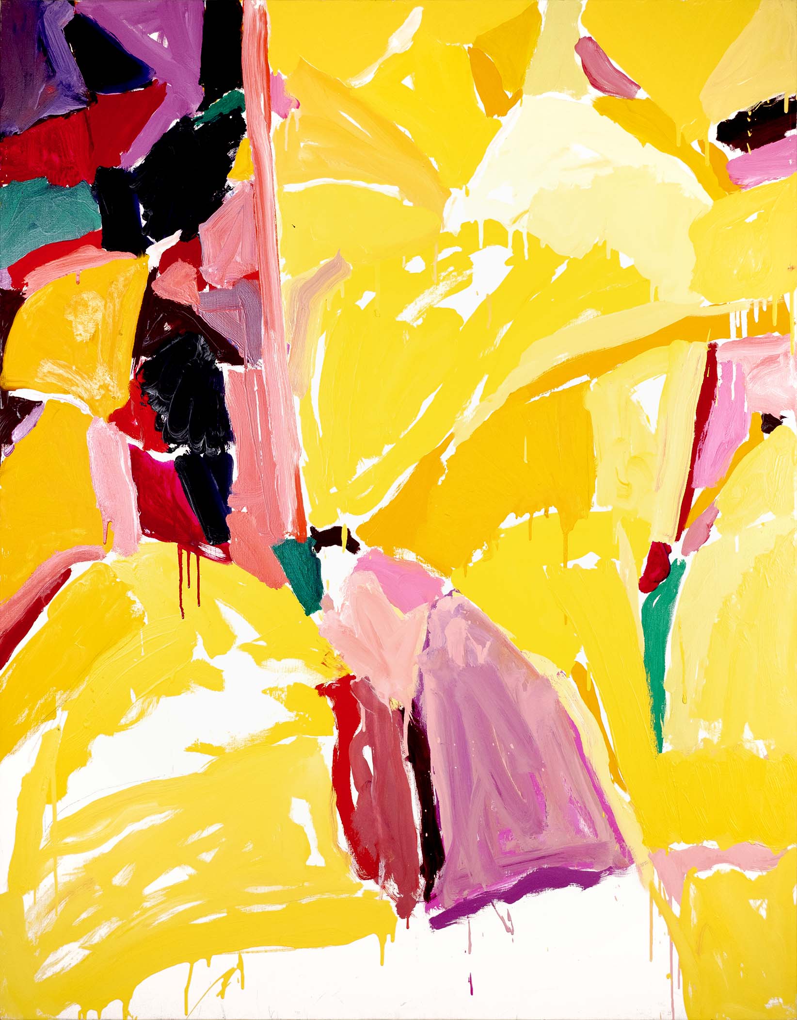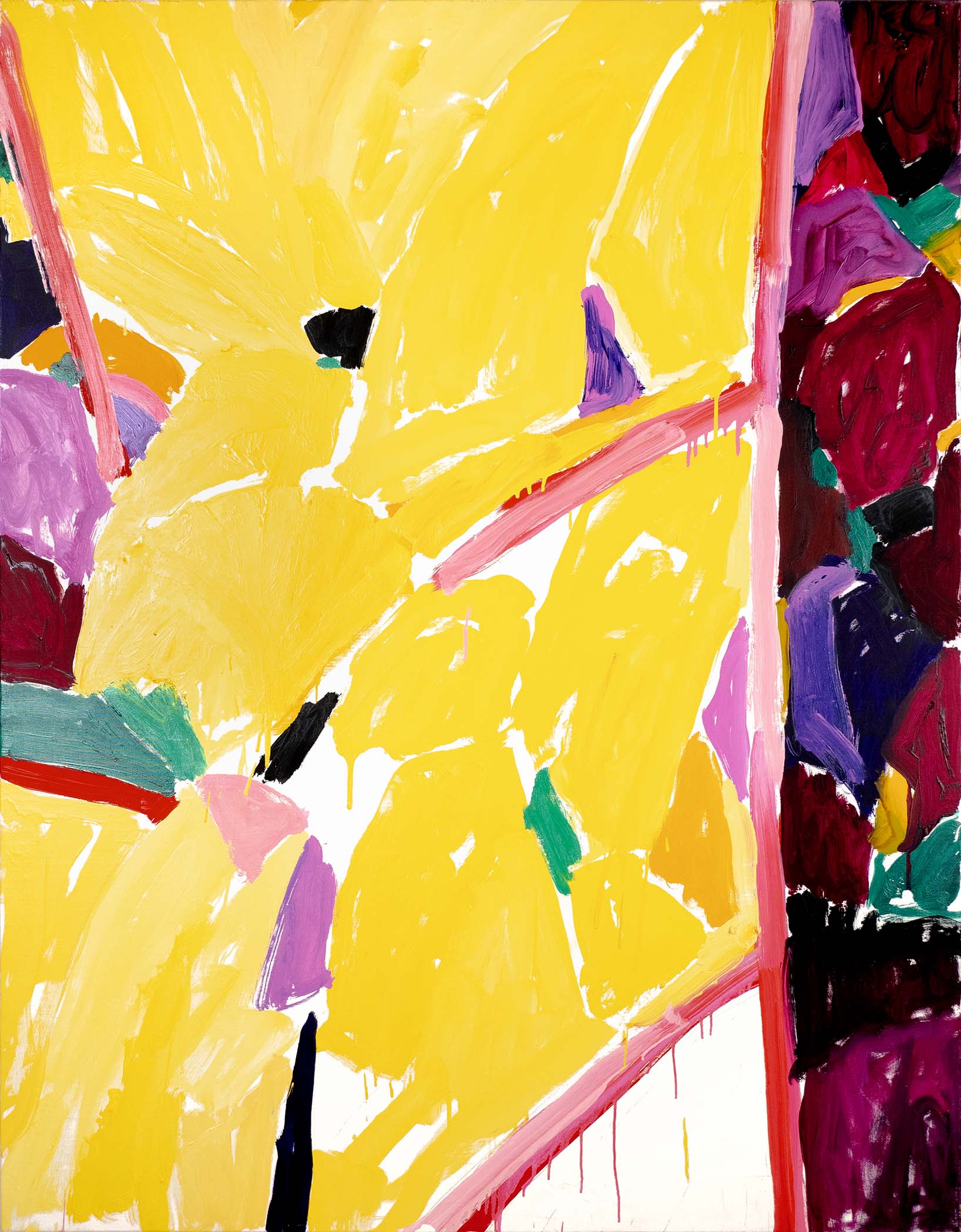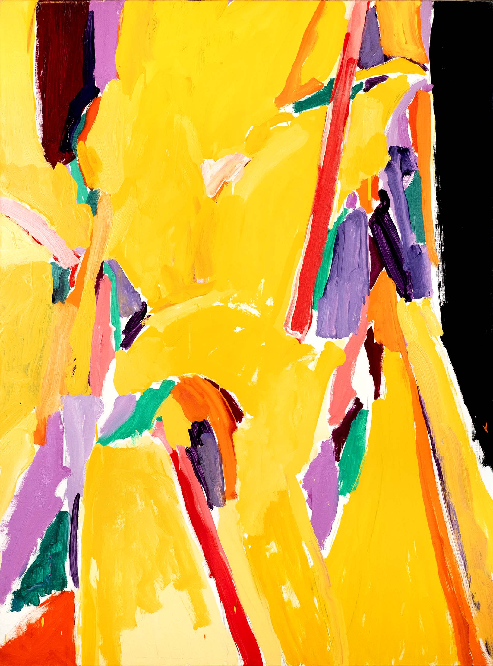 La recherche d’oppositions vives entre vides et pleins, clairs et obscurs, a atteint une sorte de maturité dès la seconde moitié des années 1980. La décennie suivante voit se prolonger cet acquis, tandis que l’inspiration végétale, bien que toujours sous-jacente, se fait de moins en moins explicite. Peu à peu, un nouvel élément visuel fait son apparition : une barre, le plus souvent verticale, vient séparer la toile en deux parties, l’une sombre, l’autre claire, comme pour rappeler les intérieurs des premières huiles, avec leur fenêtre donnant au dehors ou inversement.