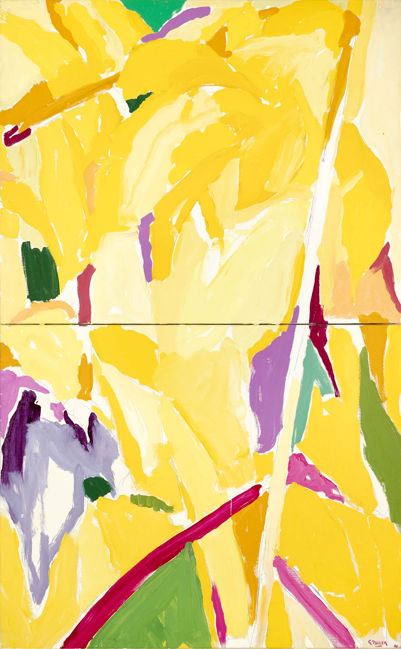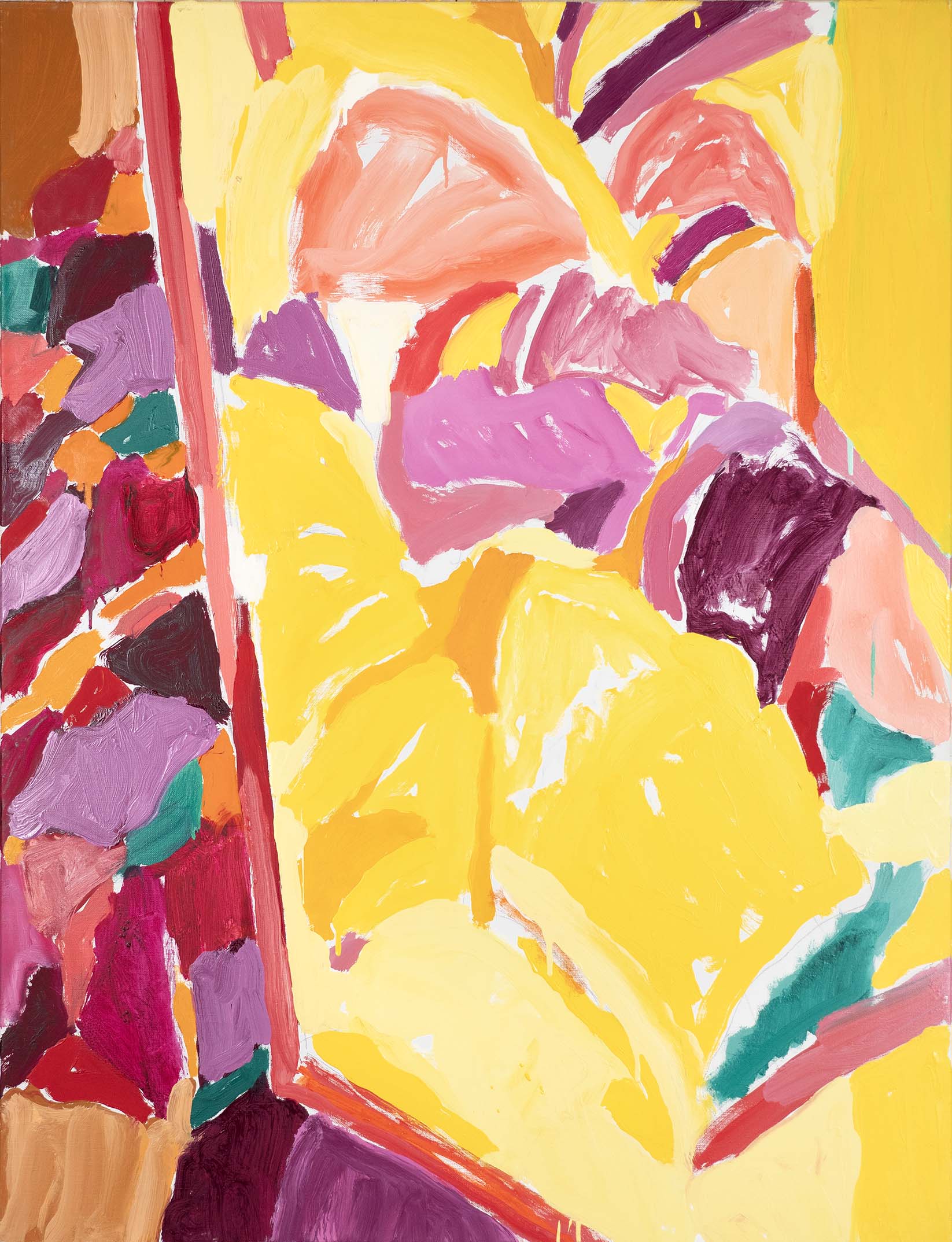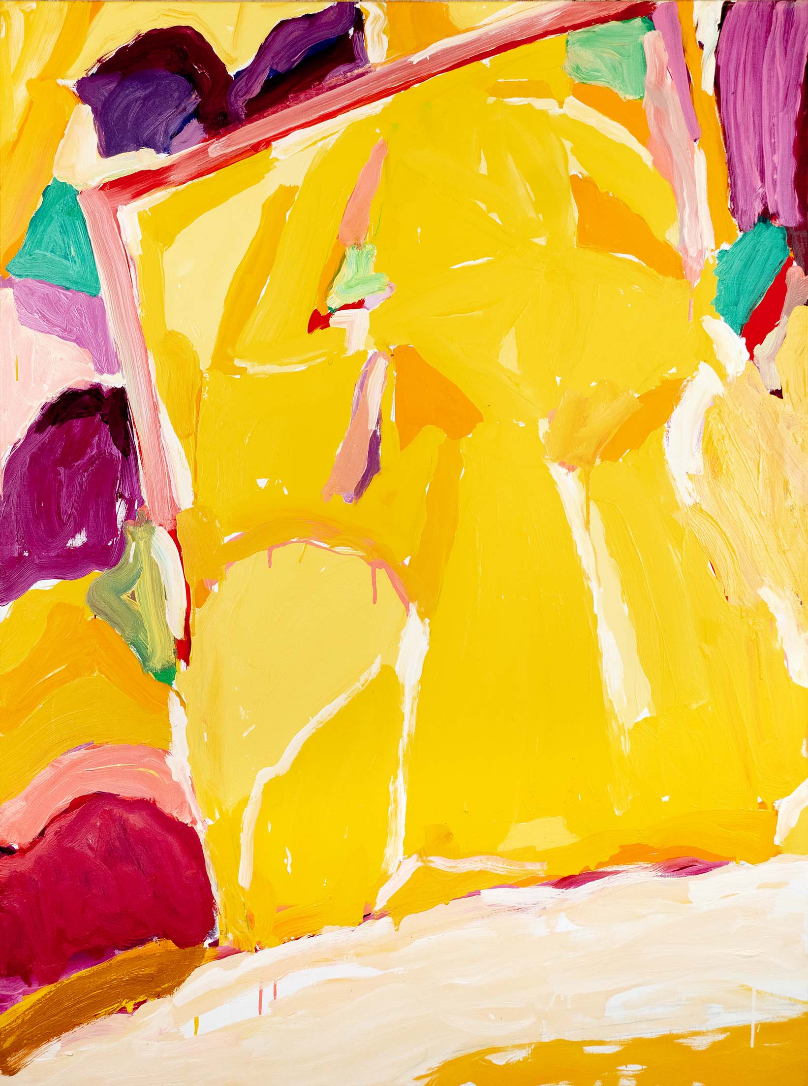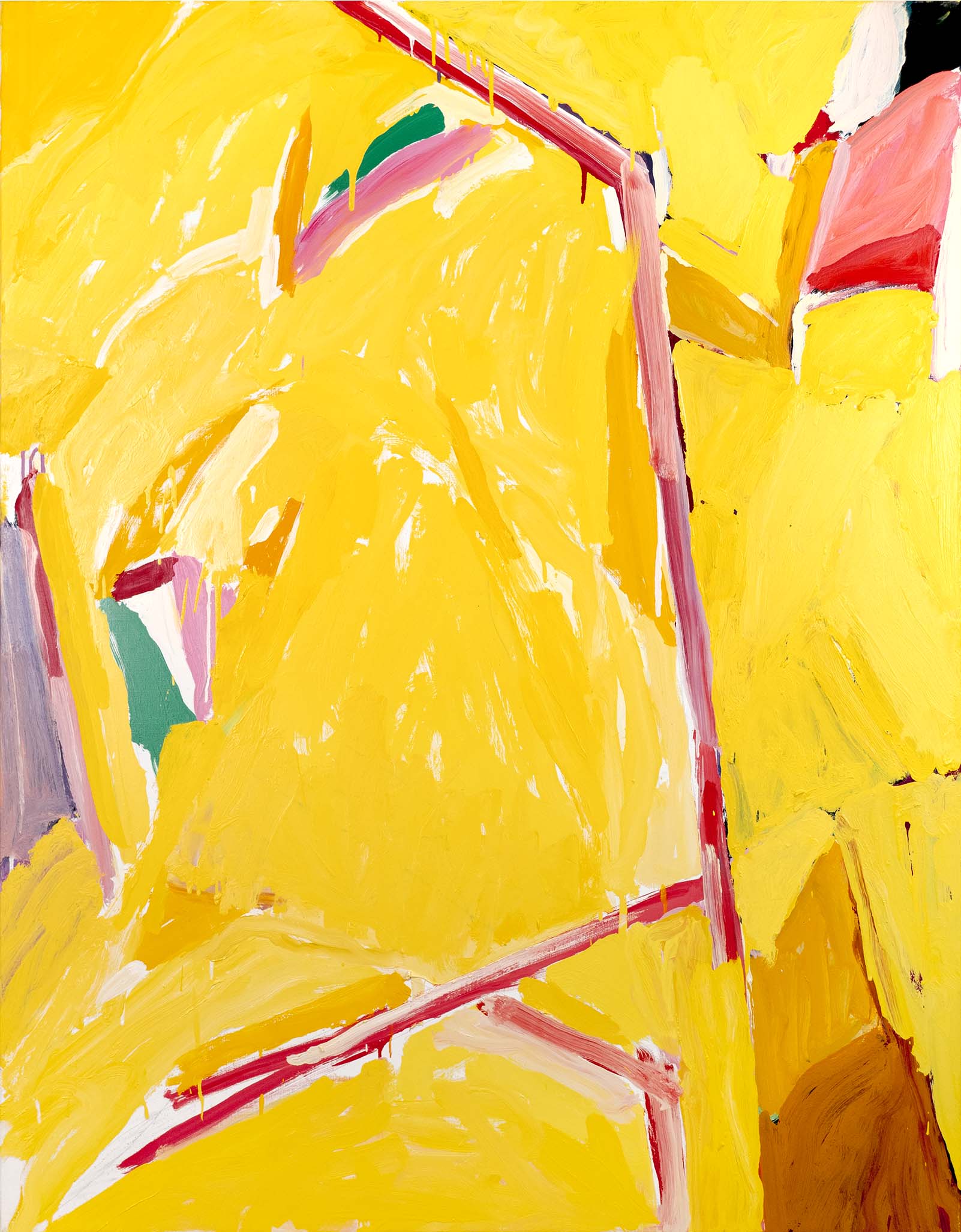 La recherche d’oppositions vives entre vides et pleins, clairs et obscurs, a atteint une sorte de maturité dès la seconde moitié des années 1980. La décennie suivante voit se prolonger cet acquis, tandis que l’inspiration végétale, bien que toujours sous-jacente, se fait de moins en moins explicite. Peu à peu, un nouvel élément visuel fait son apparition : une barre, le plus souvent verticale, vient séparer la toile en deux parties, l’une sombre, l’autre claire, comme pour rappeler les intérieurs des premières huiles, avec leur fenêtre donnant au dehors ou inversement.