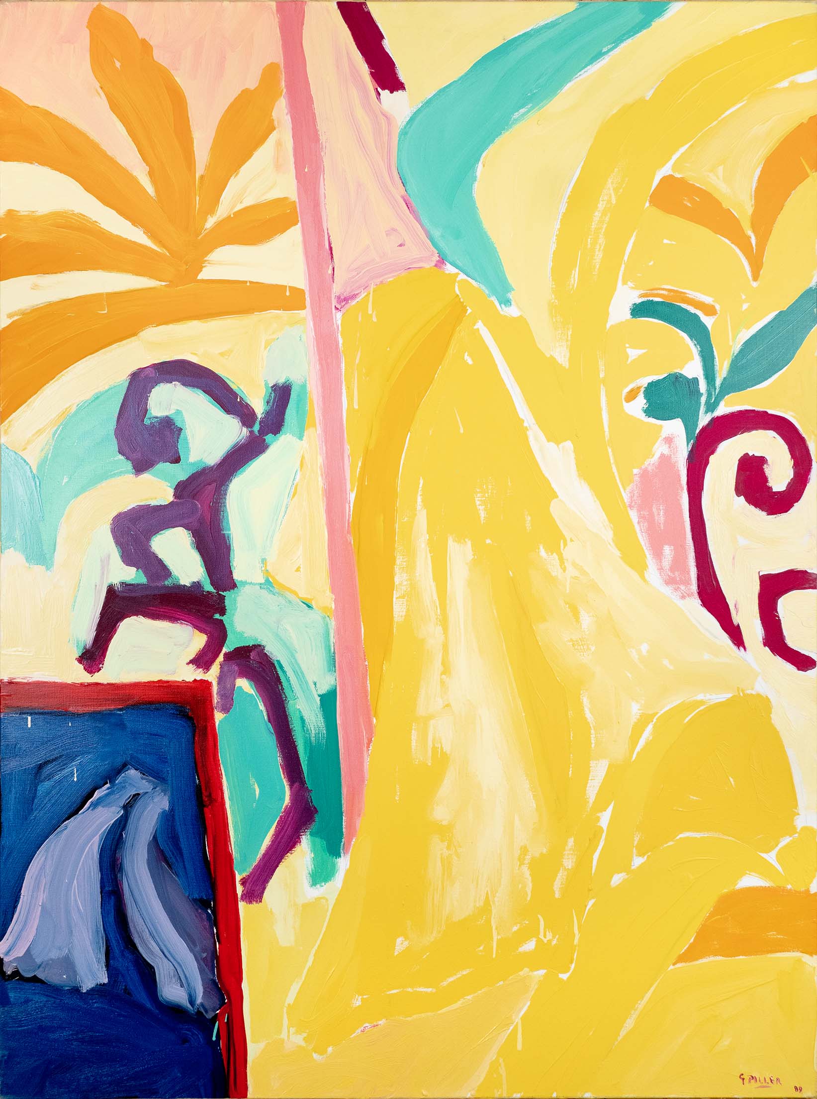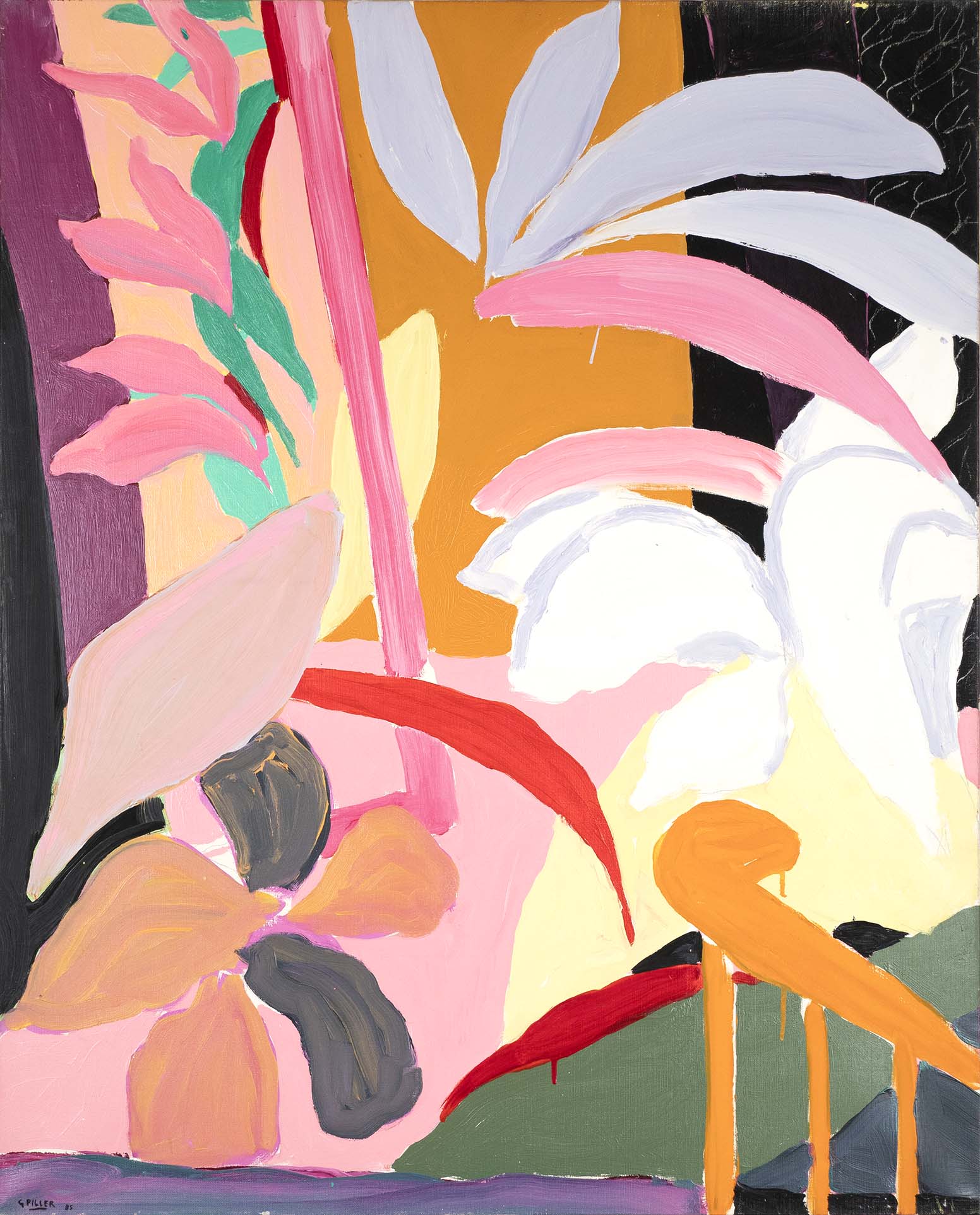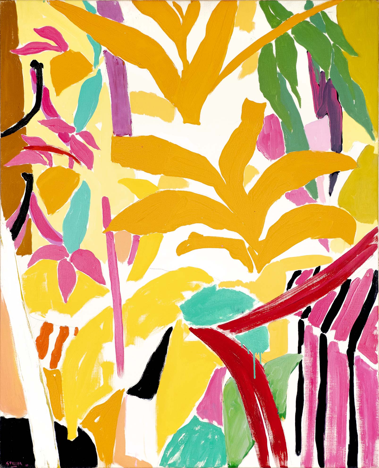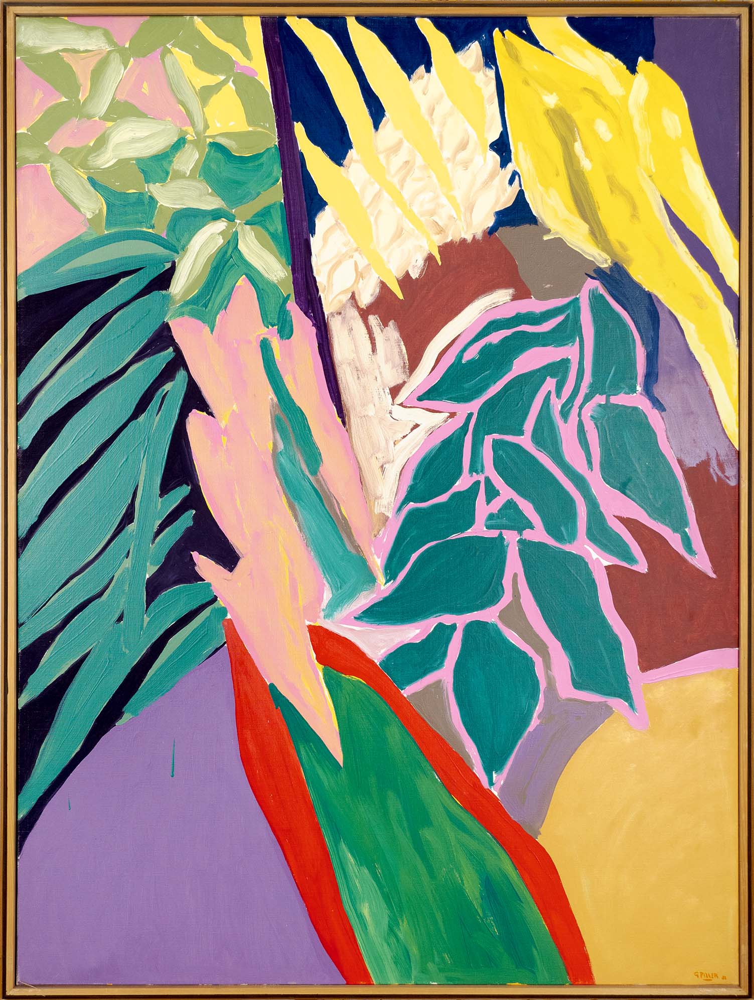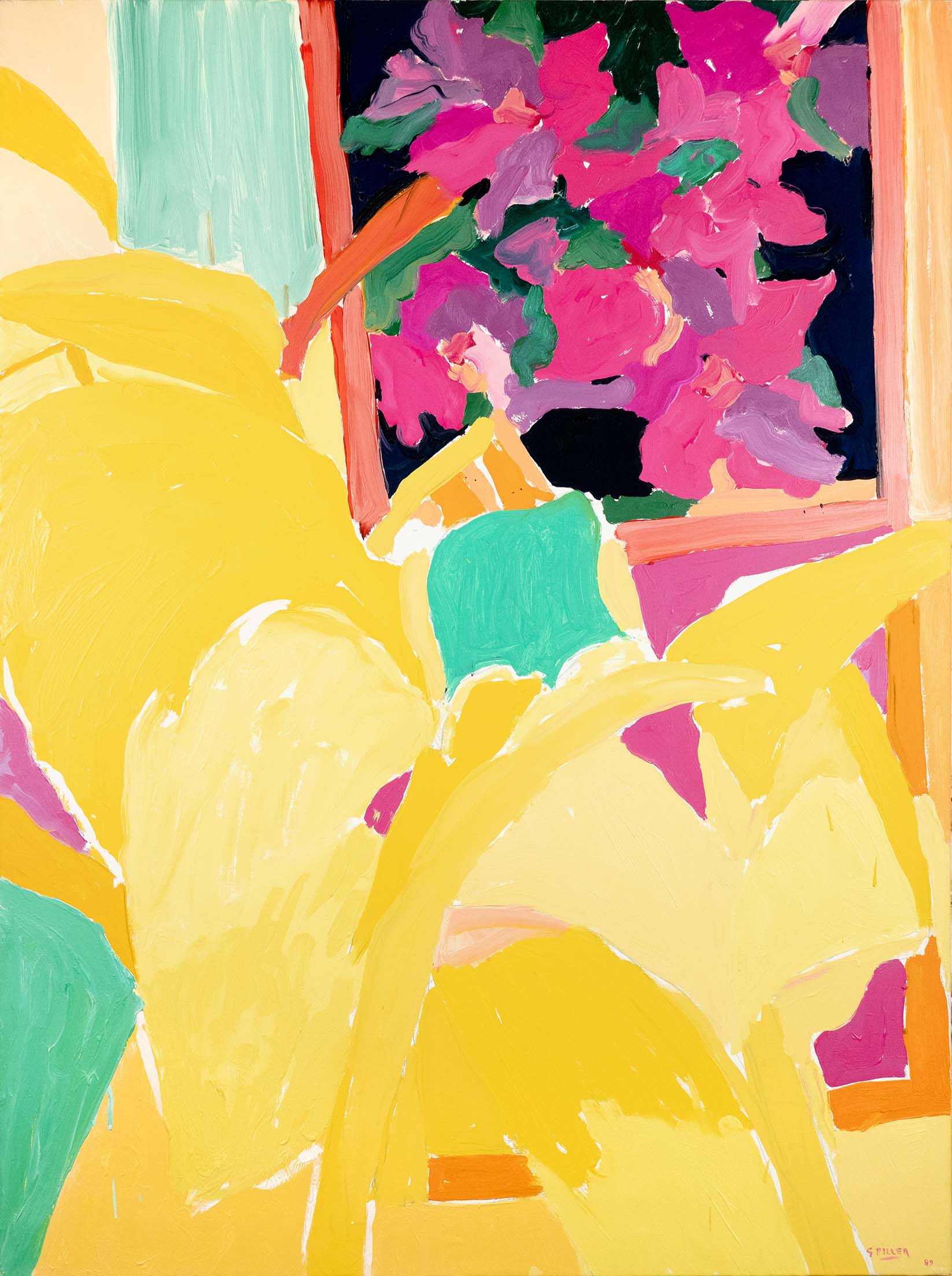 Les huiles du début de la décennie 1980 sont très proches des pastels qui les précèdent de quelques années. Le sujet y est encore largement reconnaissable : il s’agit souvent de formes végétales et d’intérieurs, qui ne sont pas sans évoquer la géométrie et la sensibilité d’un Matisse. Au fil du temps, le sujet s’estompe : l’inspiration végétale est encore prépondérante, mais les toiles gagnent en abstraction et deviennent de plus en plus le terrain de jeu de contrastes et de rythmes.
